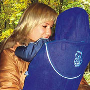 Капюшон легко отстегивается на липучках и переворачивается на 180 градусов, что позволяет накрыть голову ребенка сидящегов положении "спиной к матери".